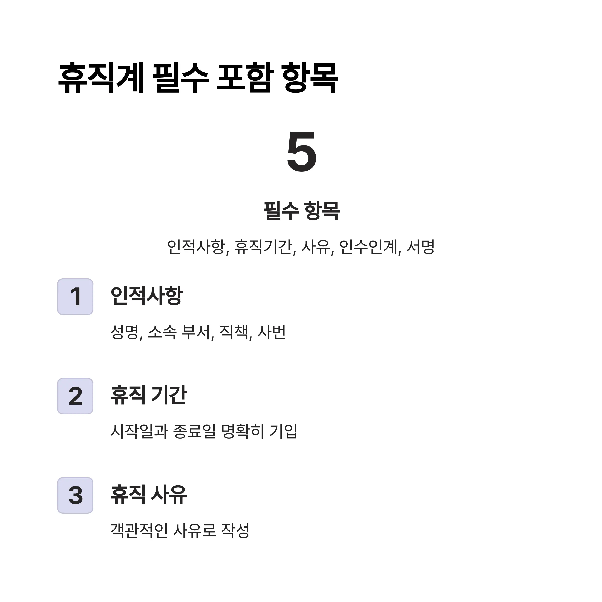 - 휴직 사유: 너무 자세하거나 모호하지 않게, 객관적인 사유로 작성