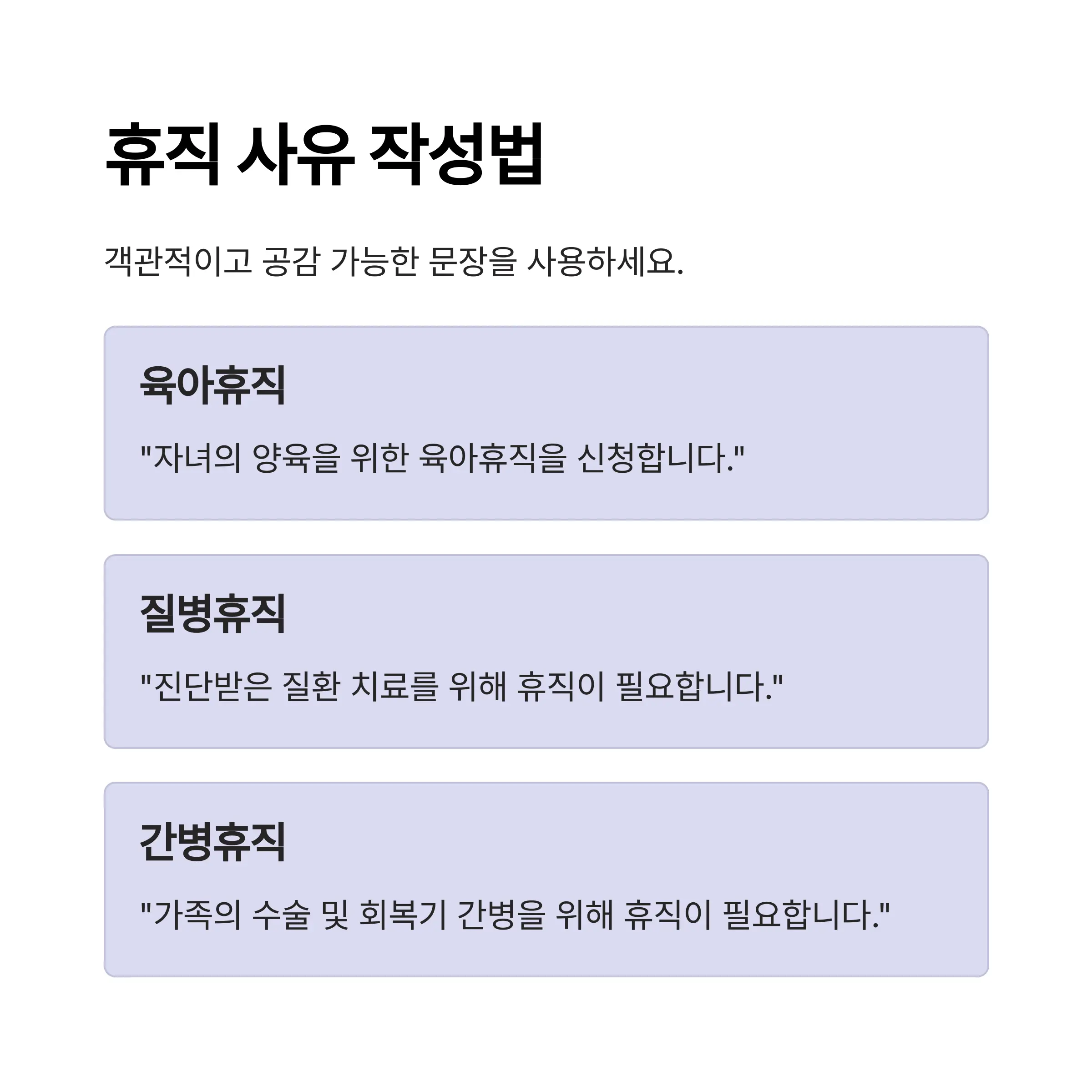 - 육아휴직: “자녀의 양육을 위한 육아휴직을 신청합니다.”