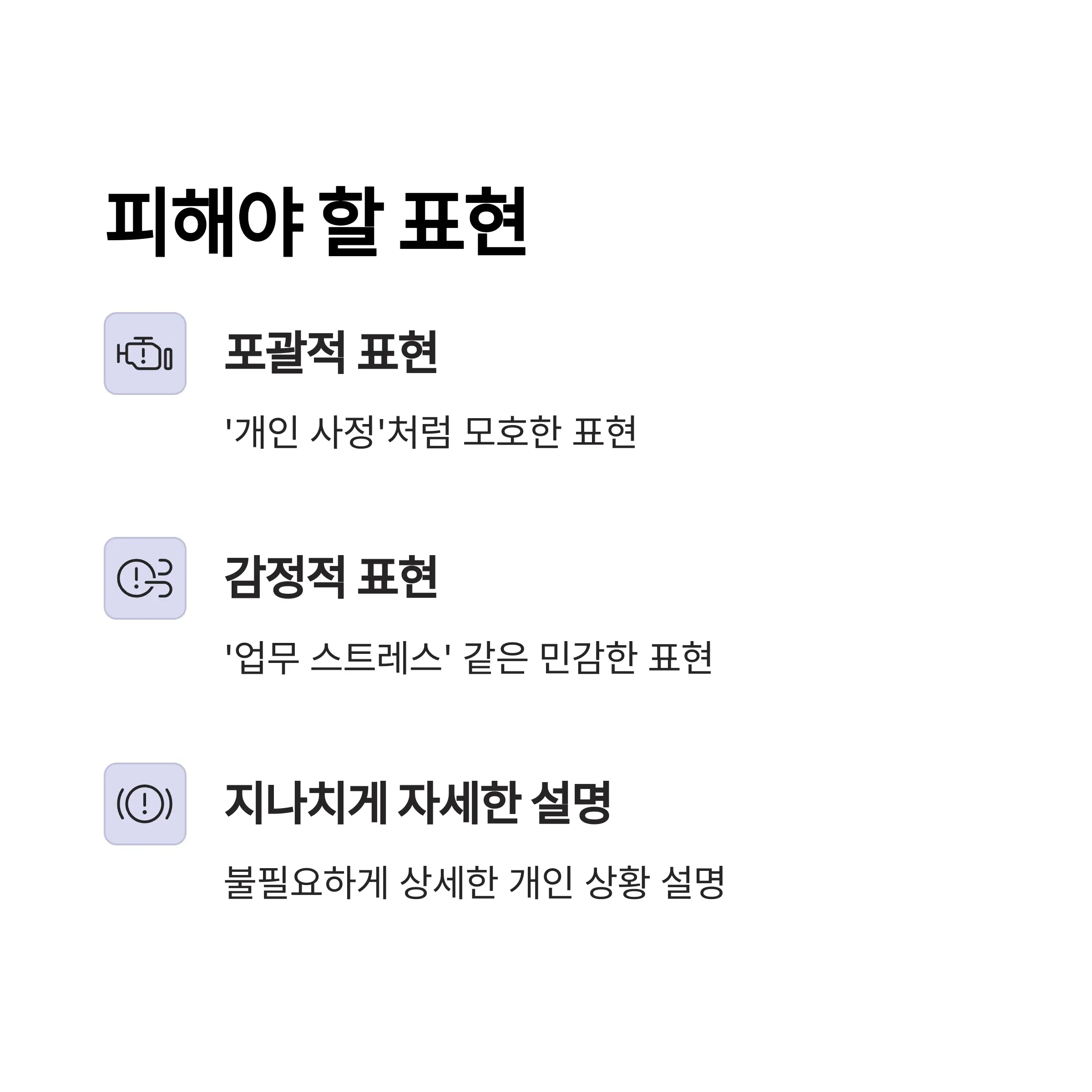 반면 ‘개인 사정’처럼 포괄적이거나 ‘업무 스트레스 때문에’와 같이 민감한 표현은 피하는 것이 좋습니다.