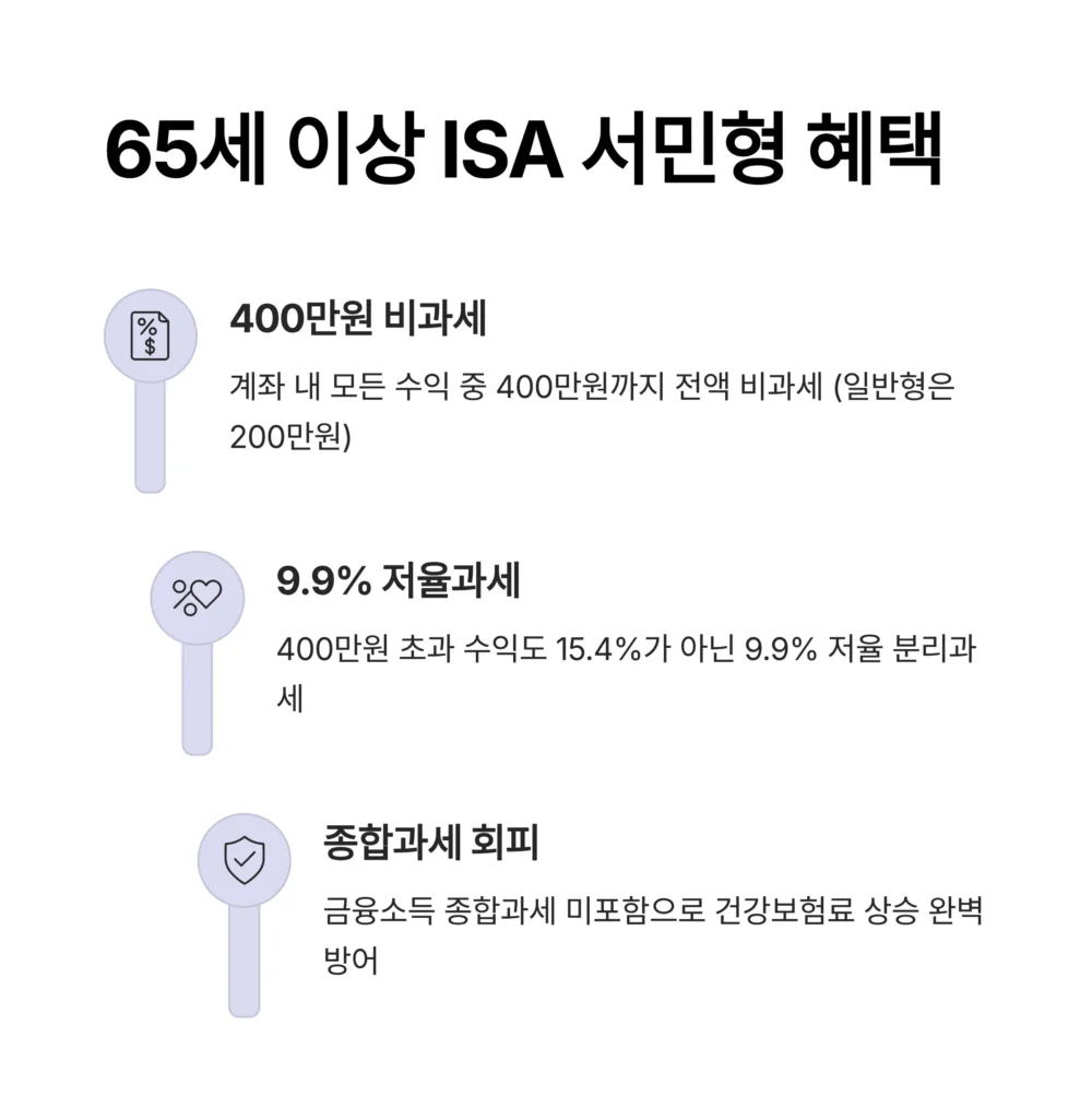 65세 이상(또는 직전 연도 총급여 5,000만원 이하 등)은 ISA 서민형 가입이 가능해 일반형보다 혜택이 훨씬 강력합니다.