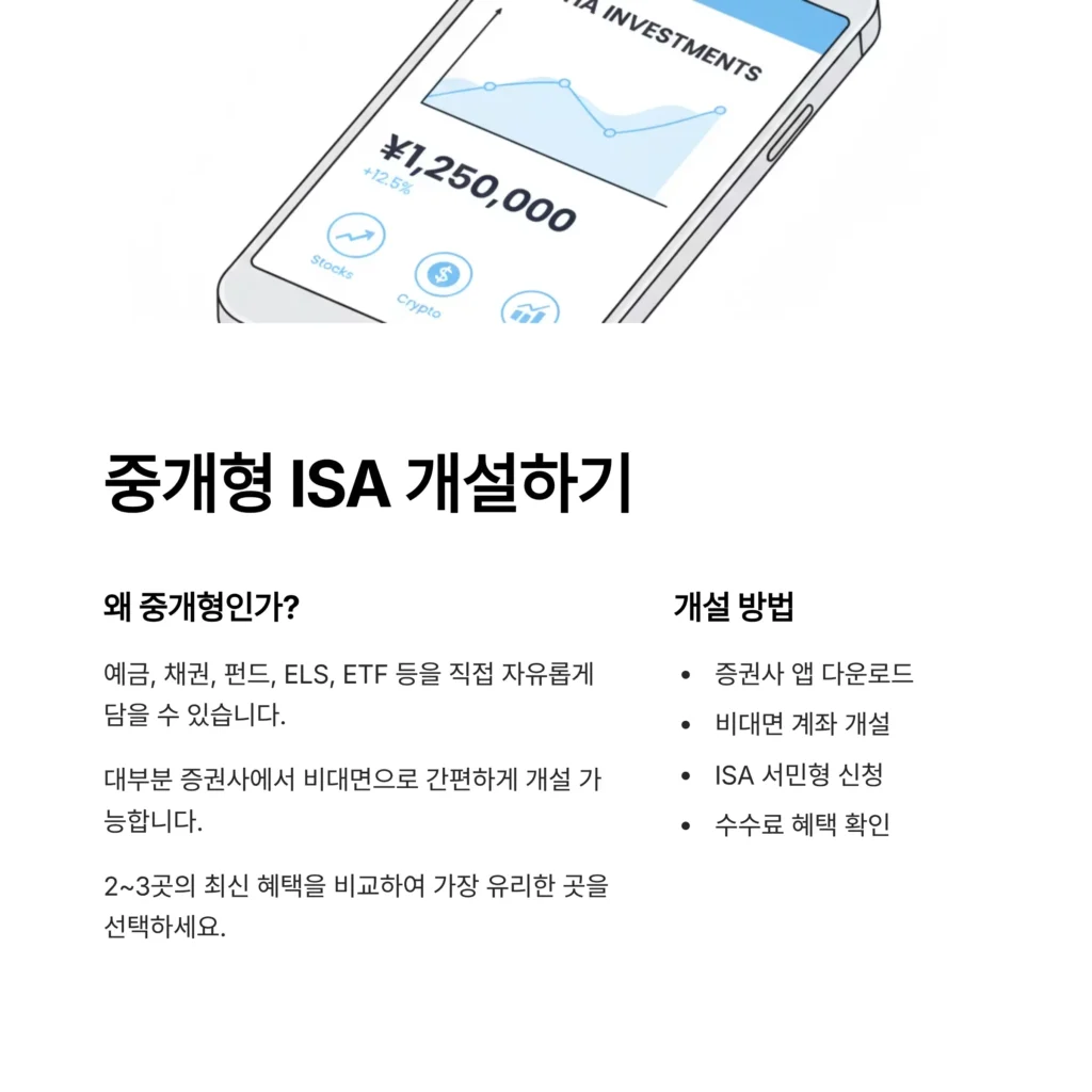 중개형 ISA는 대부분의 증권사에서 비대면으로 간편하게 개설할 수 있습니다. 증권사마다 평생 수수료 혜택이나 신규 가입 이벤트가 다르기 때문에 2~3곳의 최신 혜택을 비교해보고 보인에게 가장 유리한 곳을 선택하는 것이 좋습니다.