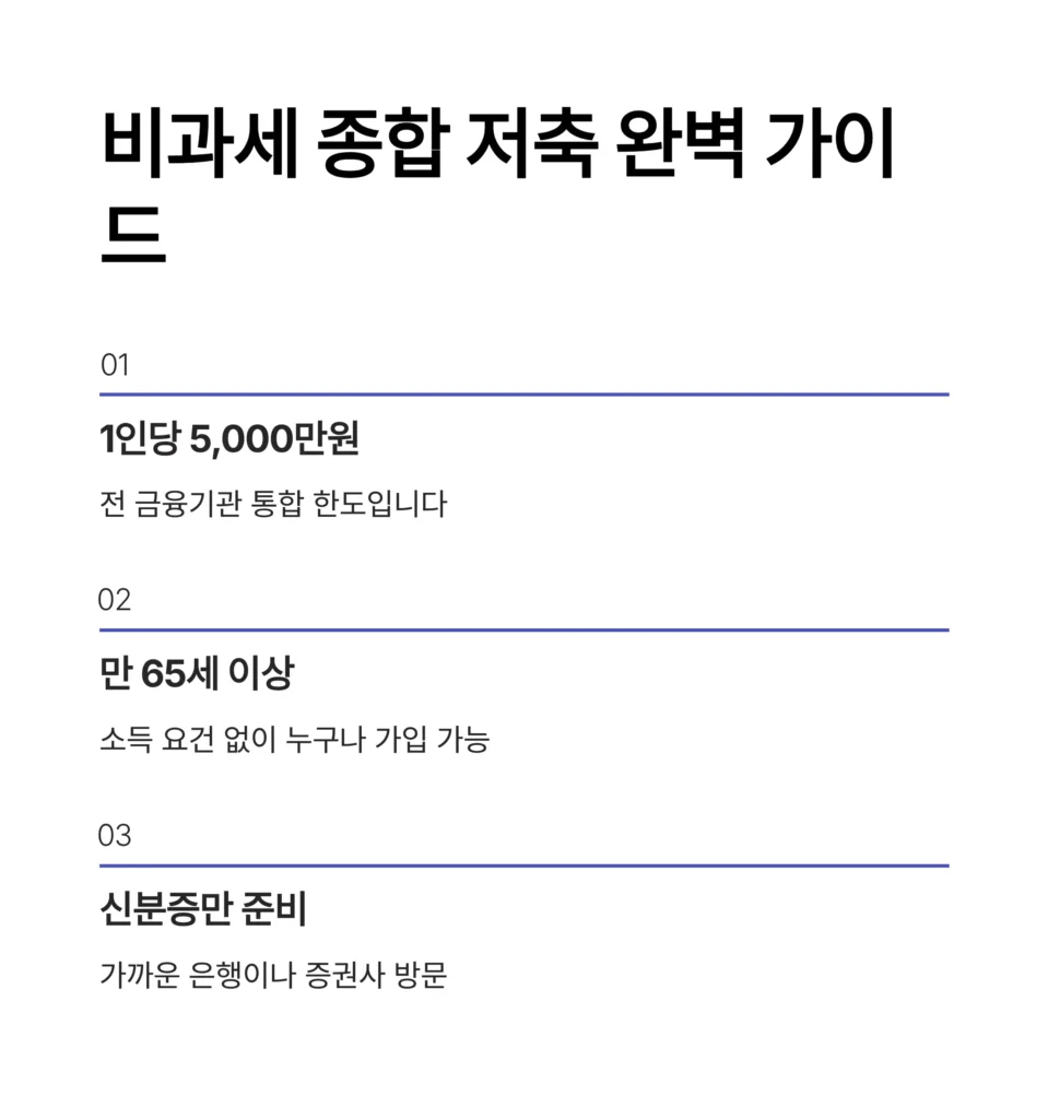 2025년 기준 만 65세 이상이시라면 비과세 종합 저축 제도를 활용해 1인당 5,000만원까지 이자 및 배당 소득에 대해 세금을 전혀 내지 않습니다.