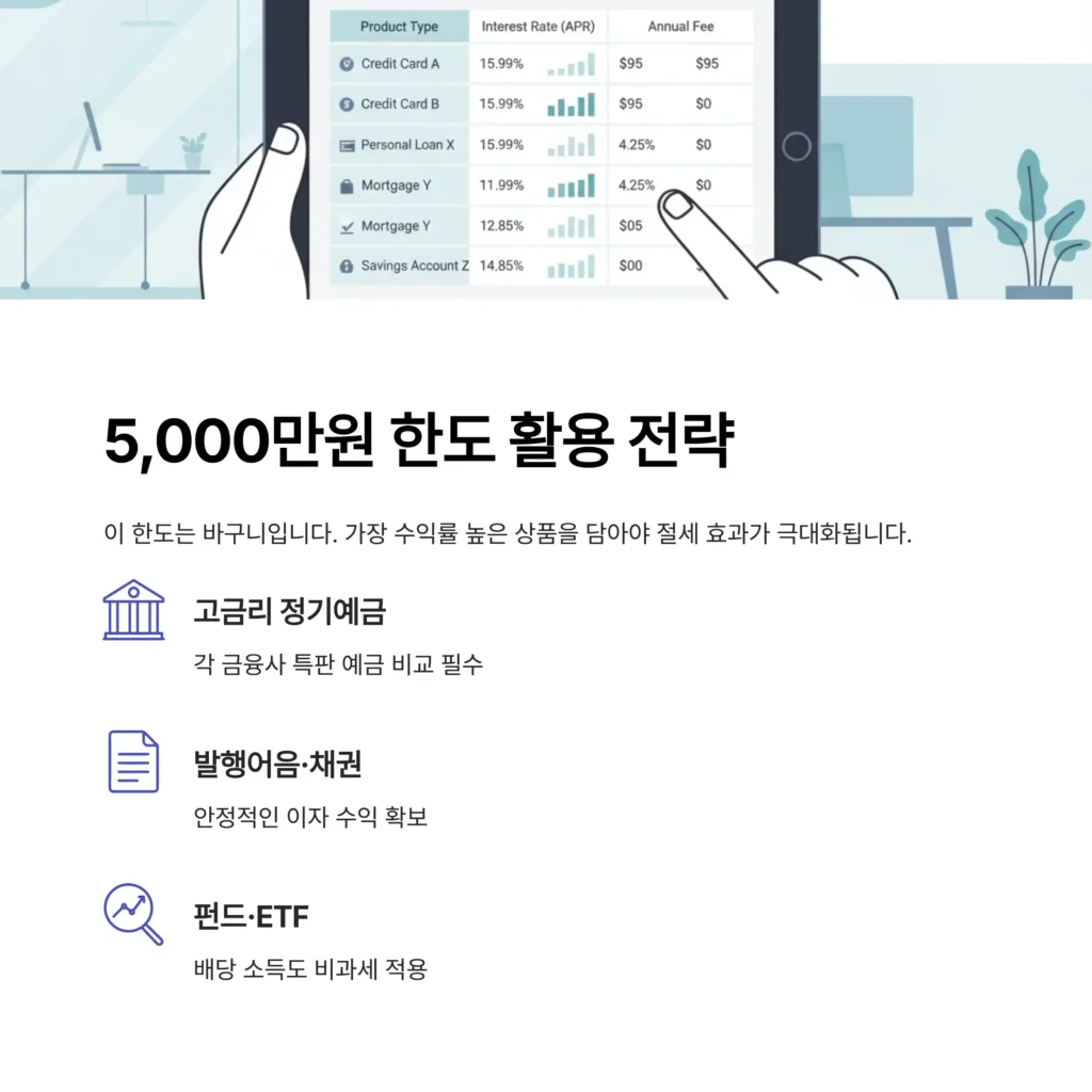 당연히 이자나 수익률이 가장 높은 상품을 담는 것이 절세 효과를 극대화하는 방법입니다. 각 금융사별로 주력으로 판매하는 고금리 상품이나 특판 예금이 다르므로 이 한도를 사용하기 전 여러곳의 최신 상품 조건을 비교해 보는 것이 현명합니다.