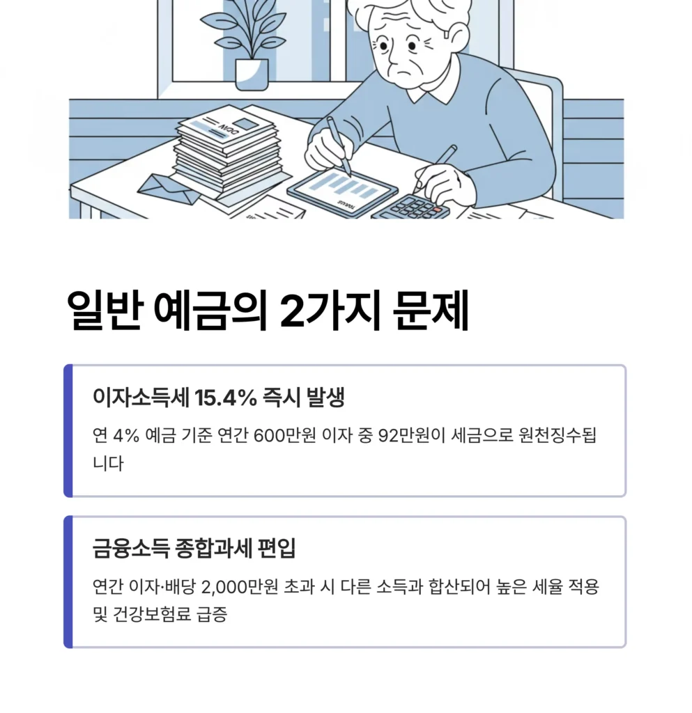 하지만 5,000만원 한도를 채우는 것은 노후 절세의 시작일 뿐입니다. 만약 5,000만원을 초과하는 나머지 목돈을 일반 예금에 그대로 두신다면 15.4%의 이자 소득세는 물론 금융소득 종합과세 대상이 되어 건강보험료가 상승할 수도 있습니다.