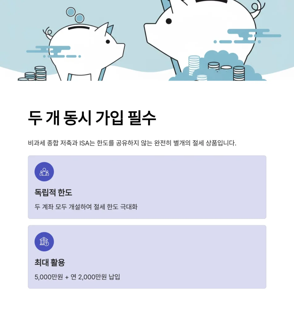 비과세 종합 저축(5,000만원 한도)과 ISA 계좌(연 2,000만원 납입)는 한도를 공유하지 않는 완전히 별개의 절세 상품입니다. 따라서 65세 이상이라면 두개의 통장을 모두 개설하여 절세 한도 총량을 극대화해야 합니다.