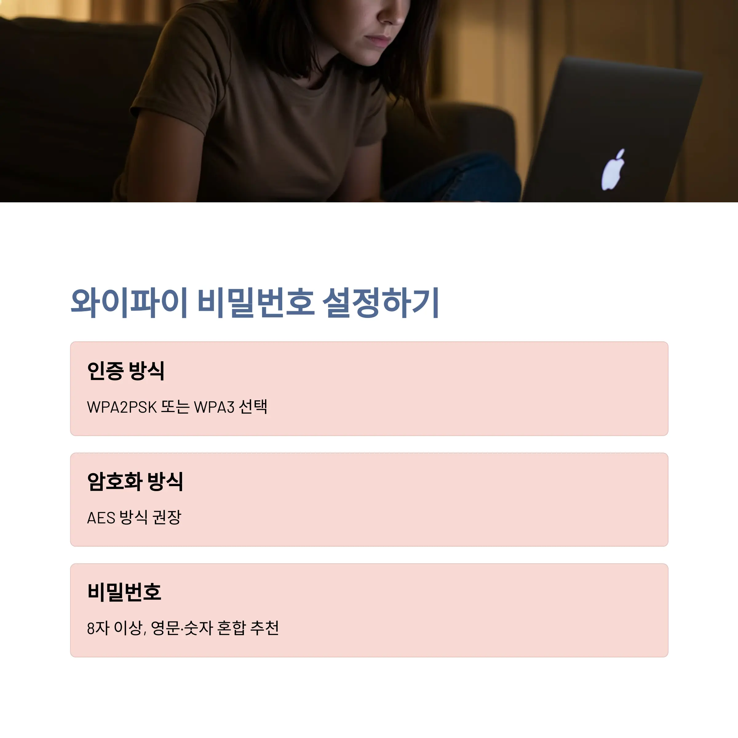 - 인증 방식: WPA2PSK 또는 WPA3 (최신 보안)
