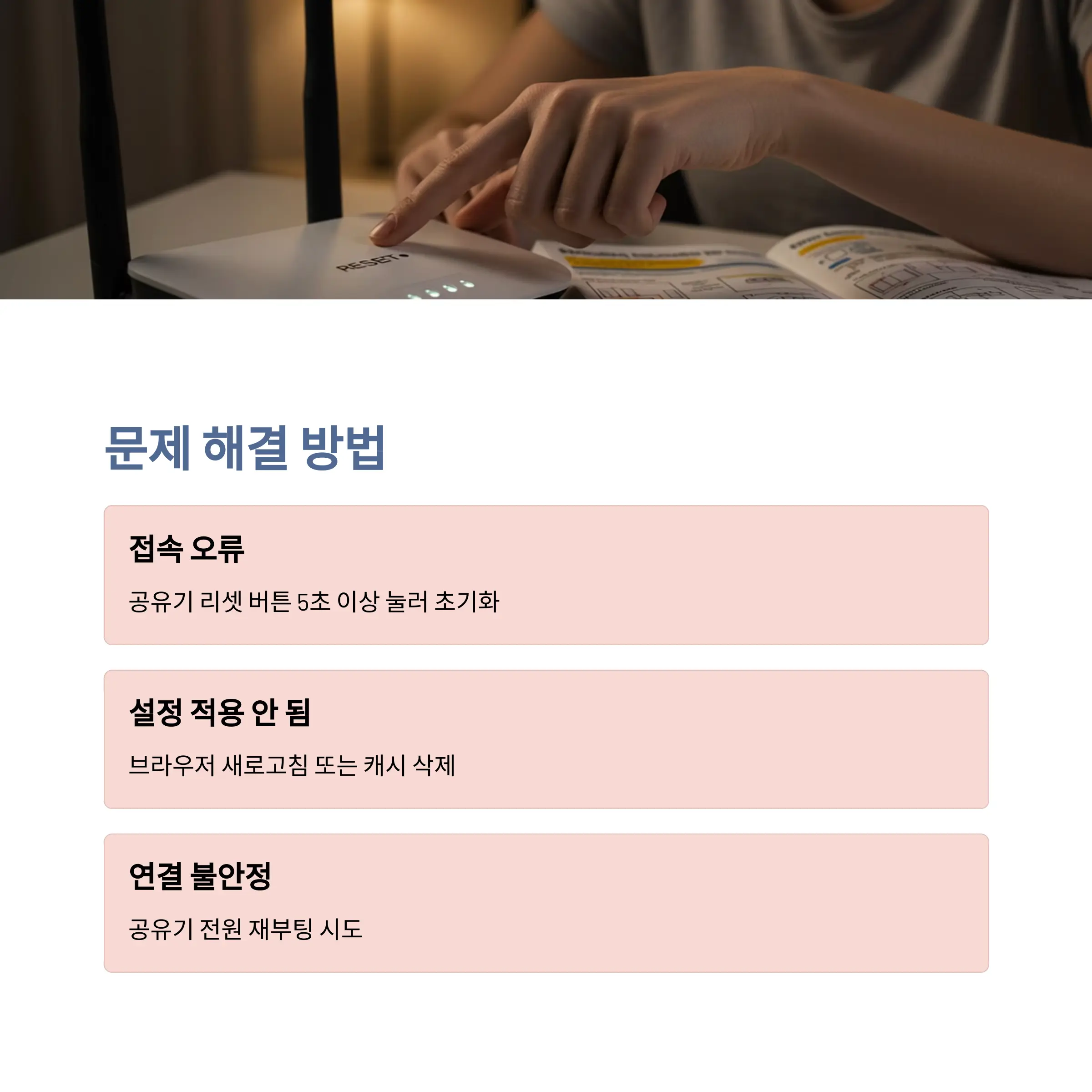 이 페이지는 공유기 설정을 위한 입구입니다. 접속이 안 될 경우 다른 설정도 변경할 수 없기 때문에, 반드시 접속 가능 상태인지 먼저 확인하는 것이 중요합니다.