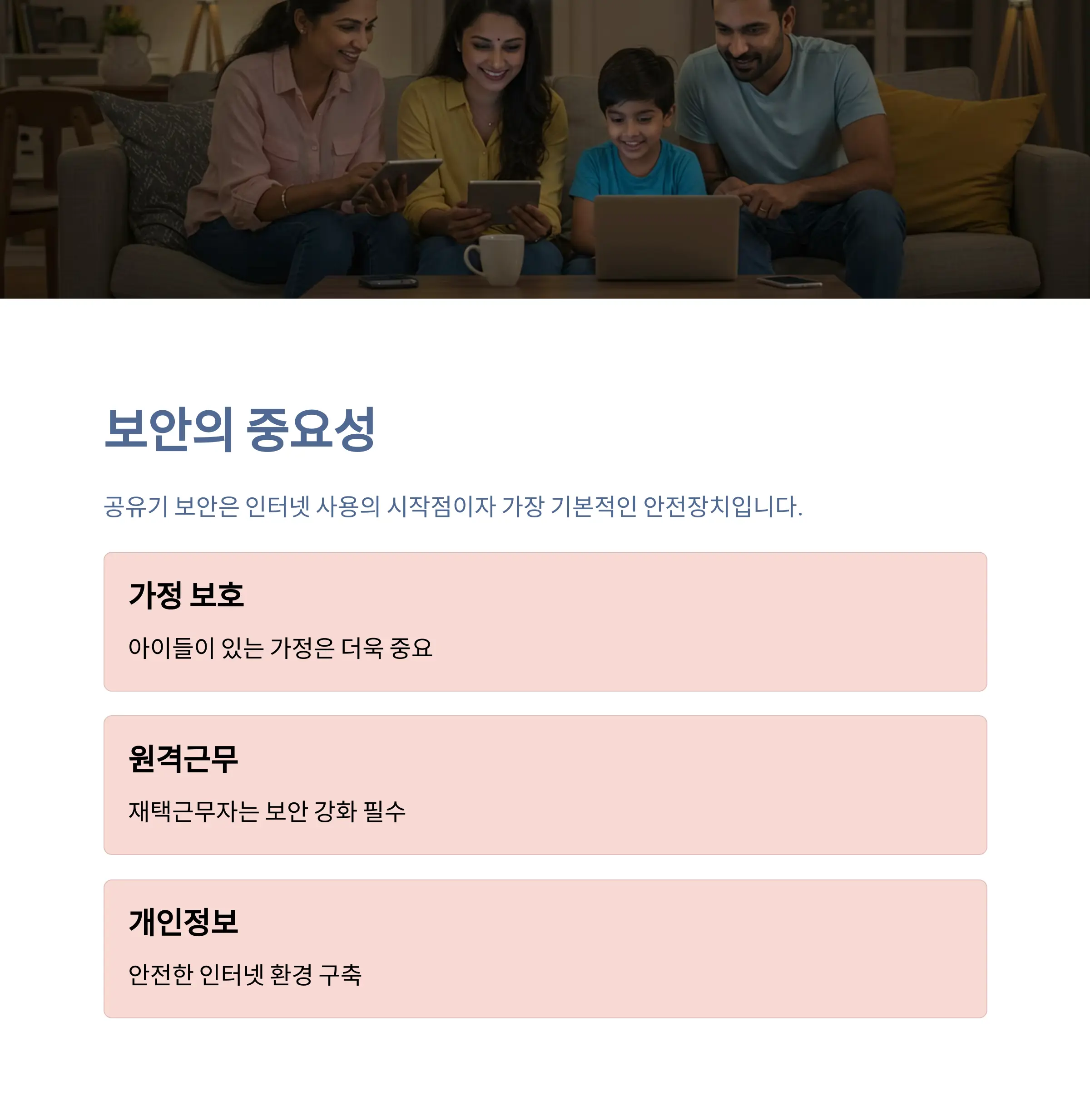 공유기 보안은 인터넷 사용의 시작점이자 가장 기본적인 안전장치입니다. 비밀번호가 없거나 너무 단순하면 외부인이 내 인터넷을 사용할 수도 있고, 개인정보 유출로까지 이어질 수 있습니다.