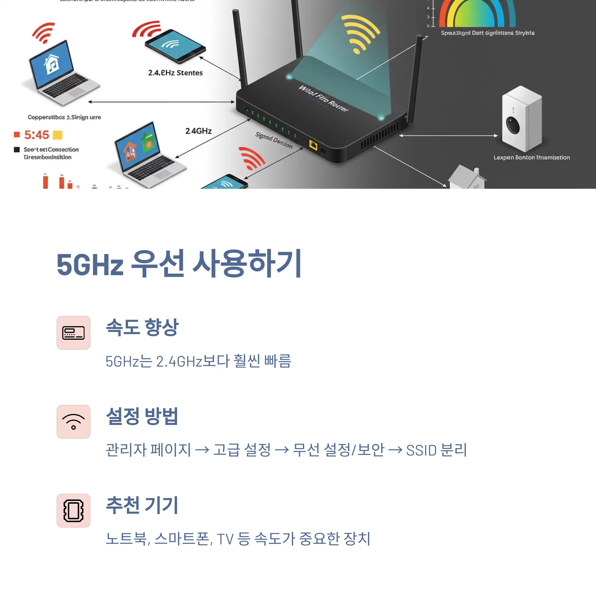 - 노트북, 스마트폰, TV 등 속도가 중요한 장치는 5GHz로 연결
