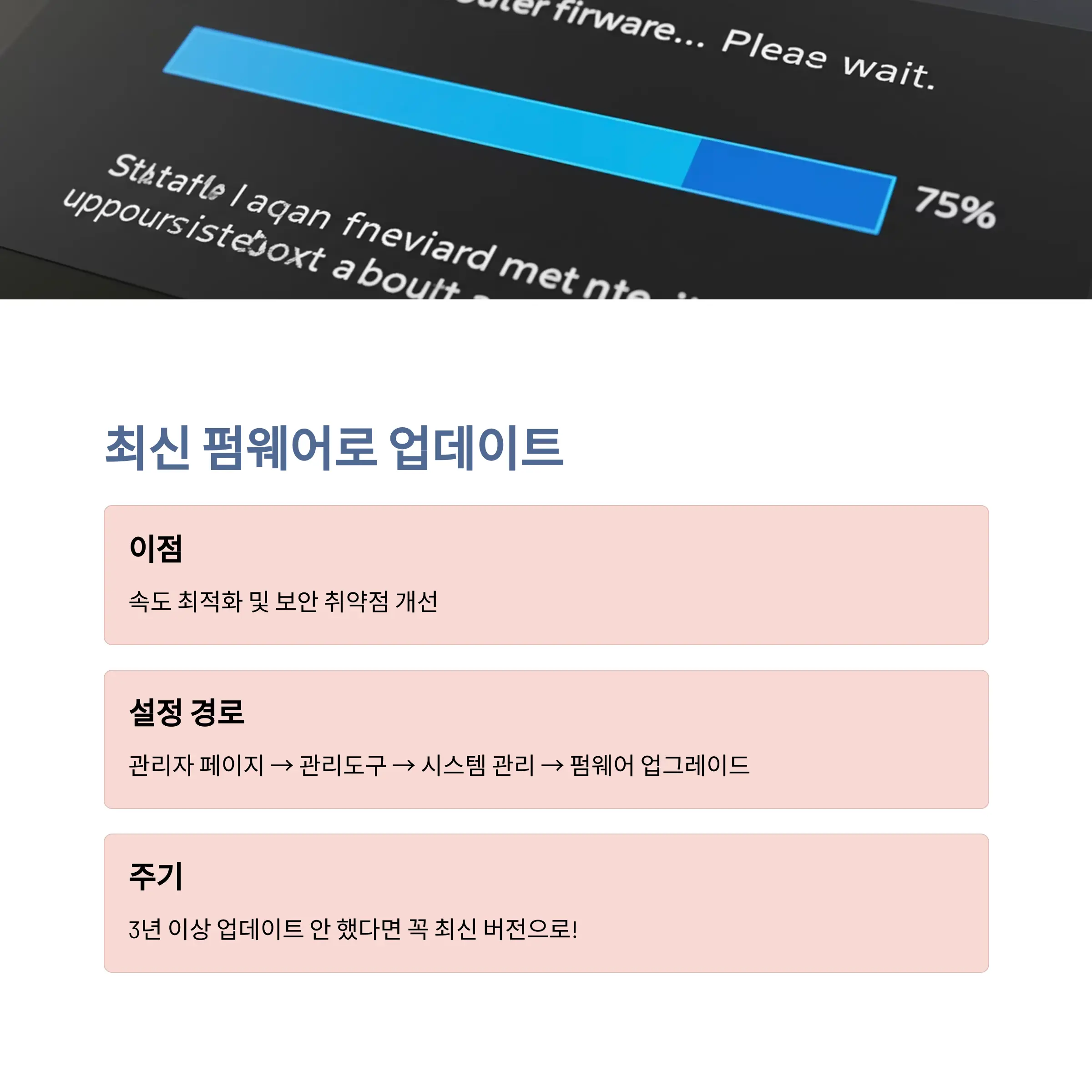 공유기도 소프트웨어 업데이트가 필요합니다. 구버전 펌웨어는 속도나 보안에서 불안정할 수 있습니다. 새 펌웨어에는 종종 버그 수정이나 속도 최적화 코드가 포함되어 있어, 간단한 업데이트만으로도 성능이 좋아지기도 합니다.