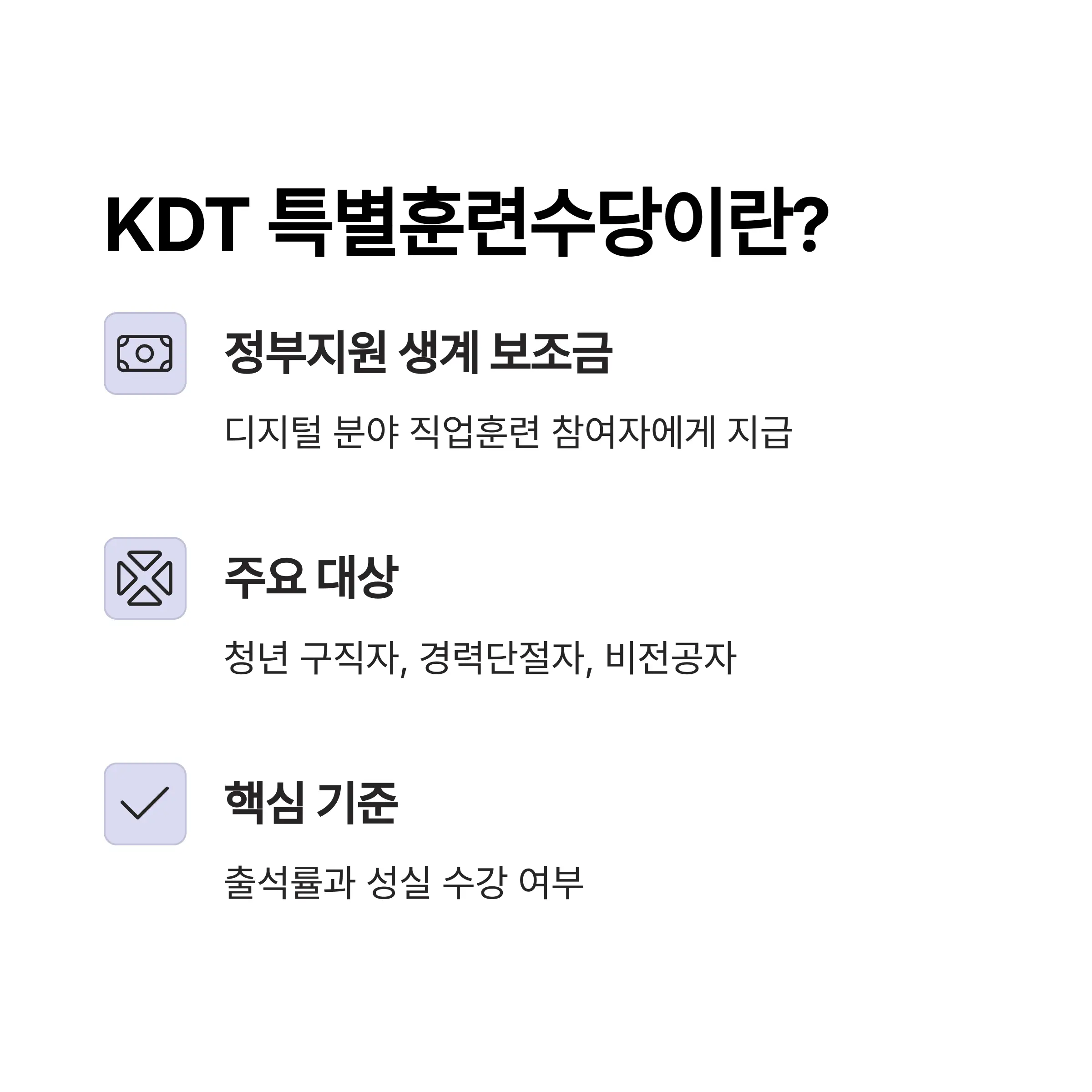 KDT 특별훈련수당은 디지털 분야 직업훈련에 참여하는 훈련생에게 지급되는 정부지원 수당입니다. 고용노동부가 지원하고, 훈련기관을 통해 간접적으로 지급되며, 주로 청년 구직자, 경력단절자, 비전공자 대상 훈련생에게 해당됩니다.