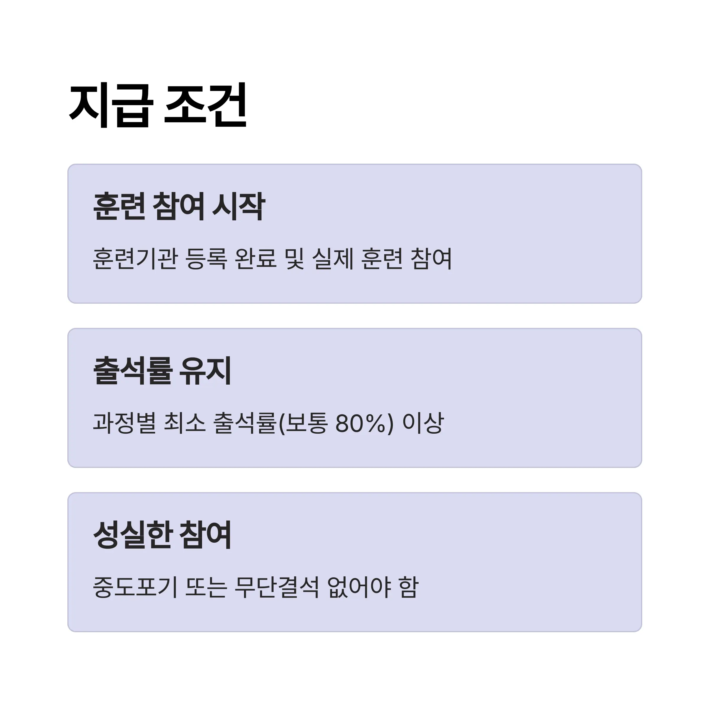 단순한 장려금이 아닌 ‘훈련에 집중할 수 있는 생계 보조금’의 성격을 띠며, 훈련 참여율에 따라 지급 여부가 결정됩니다. 즉, ‘출석률’과 ‘성실 수강’이 핵심 기준입니다.
