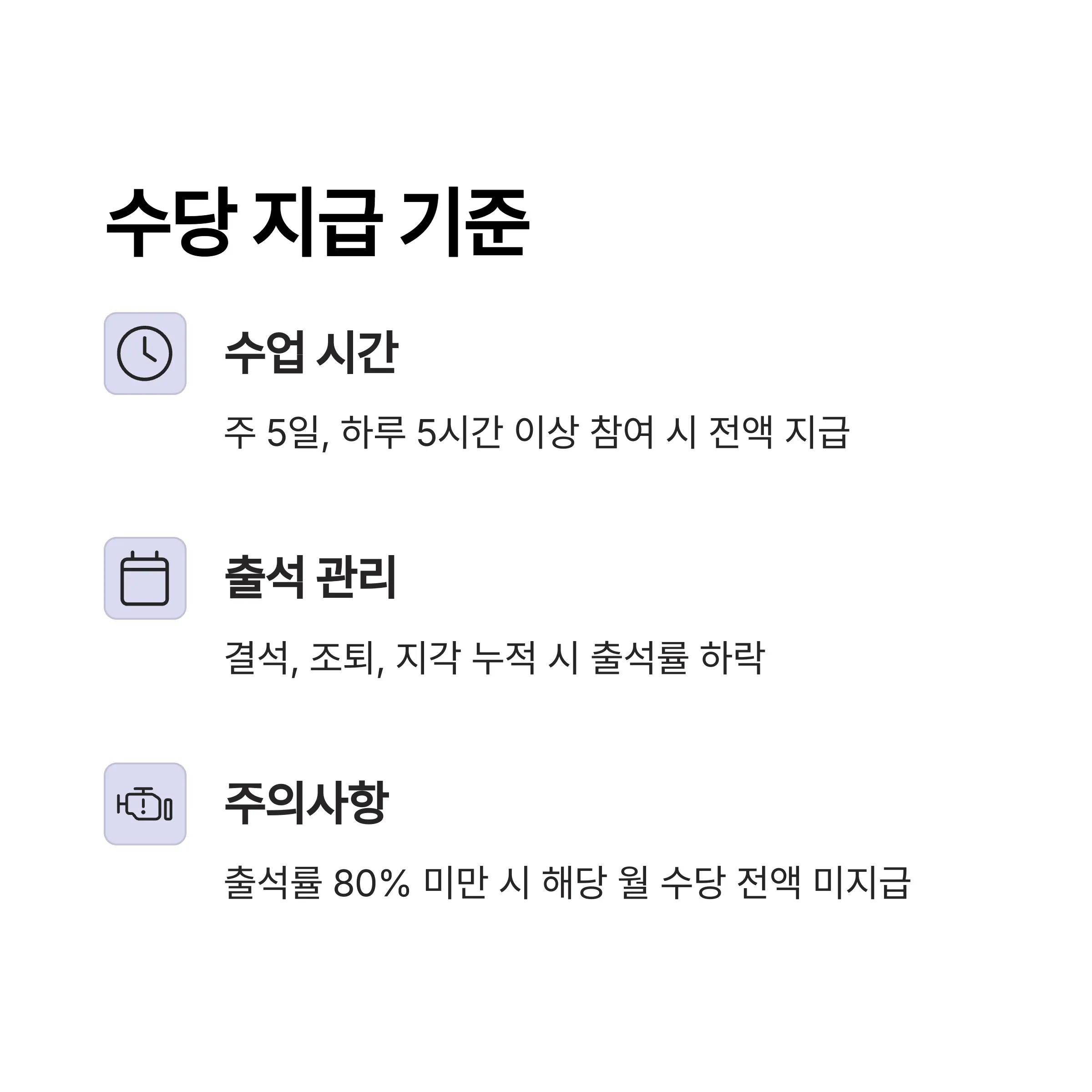 - 출석률 80% 이상이어야 해당 월 수당 지급 가능