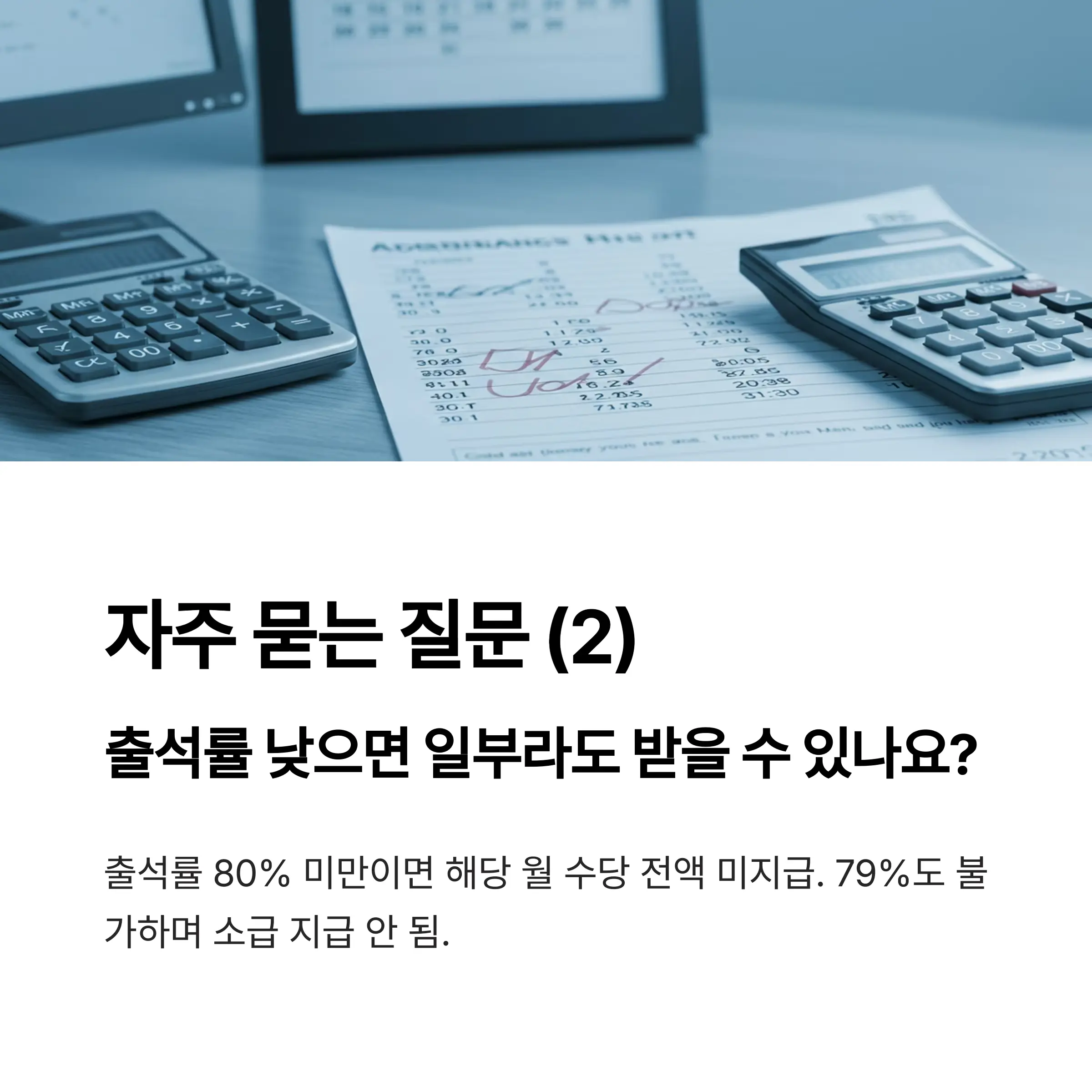 - 출석률이 80% 미만이면 해당 월 수당 전액 미지급입니다.