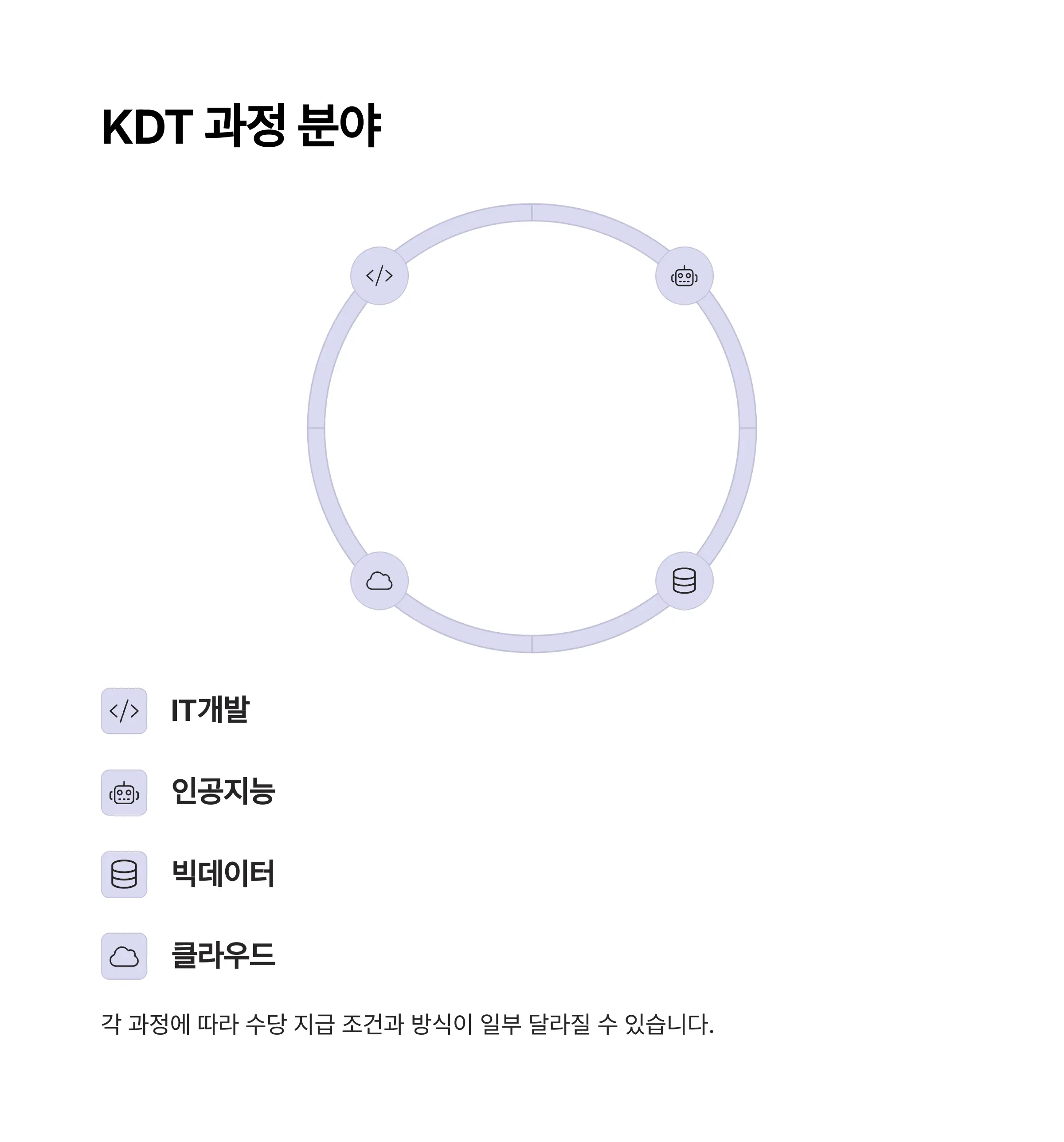 KDT 과정은 IT개발, 인공지능, 빅데이터, 클라우드 등 다양한 분야로 운영되며, 각 과정에 따라 수당 지급 조건과 방식이 일부 달라질 수 있습니다.