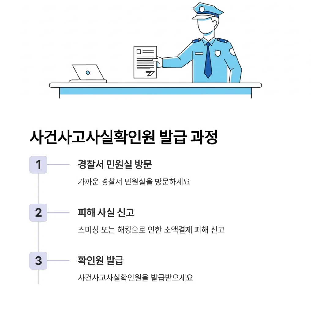 신고와 별개로 공식적인 피해 구제를 위해서는 경찰의 서류가 필요합니다. 가까운 경찰서 민원실을 방문하여 스미싱 또는 해킹으로 인한 소액결제 피해 사실을 신고하고 ‘사건사고사실확인원’을 발급받으세요.