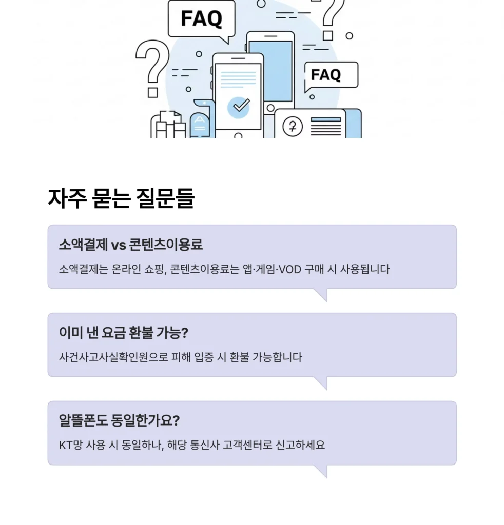 A: 비슷하지만 조금 다릅니다. ‘소액결제’는 보통 온라인 쇼핑몰 등에서 물건을 살 때 사용되며 ‘콘텐츠 이용료’는 앱 마켓(구글 플레이 등), 게임 아이템, VOD 등 디지털 콘텐츠를 구메할 때 사용됩니다. 두 가지 모두 ‘마이 케이티’에서 확인 및 차단이 가능합니다.