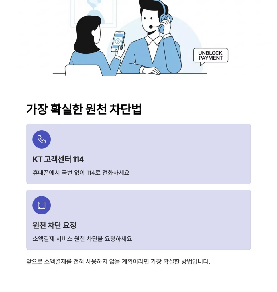 • 휴대폰에서 국번 없이 114(KT 고객센터)로 전화하여 상담원에게 소액결제 서비스 원천 차단을 요청한다고 말씀하시면 됩니다.