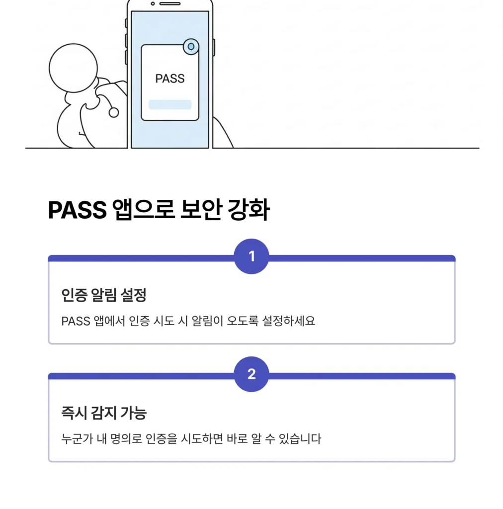 PASS 앱을 사용한다면 인증 시도가 있을 때마다 알림이 오도록 설정하여 누군가 내 명의로 인증을 시도하는 것을 즉시 알아챌 수 있습니다.